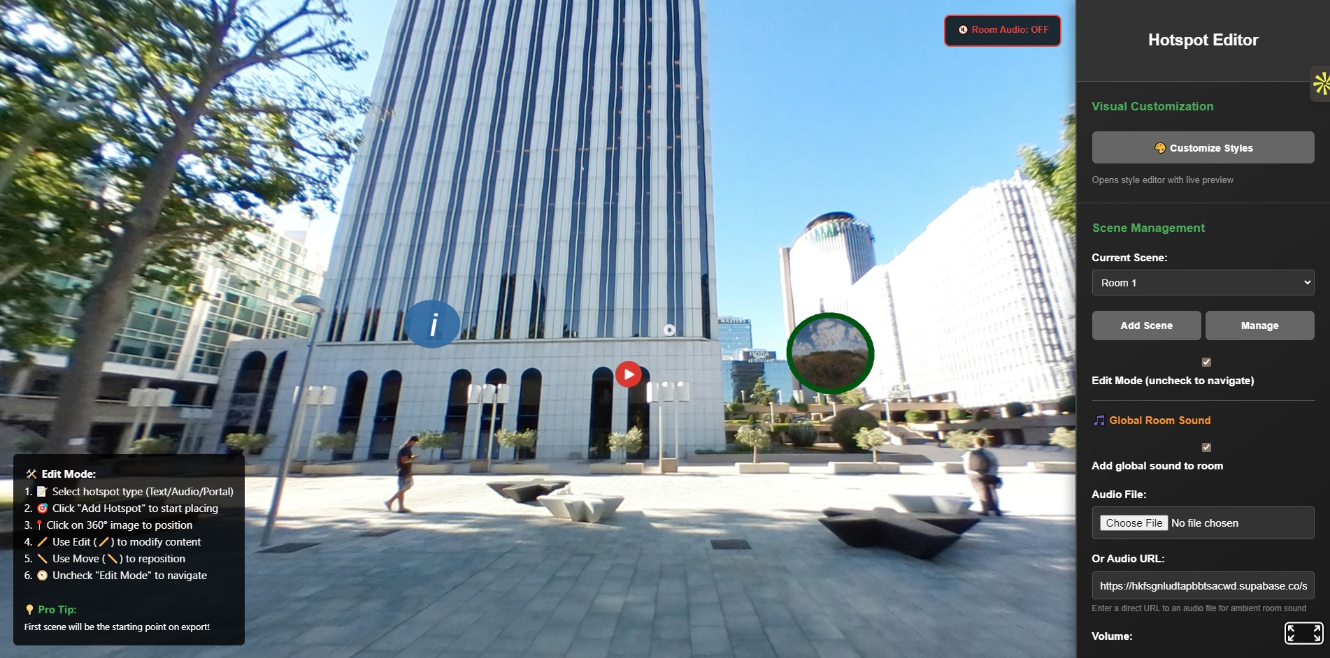 Jump into virtual world and create VR hotspots which supports different scene audio and visuals!